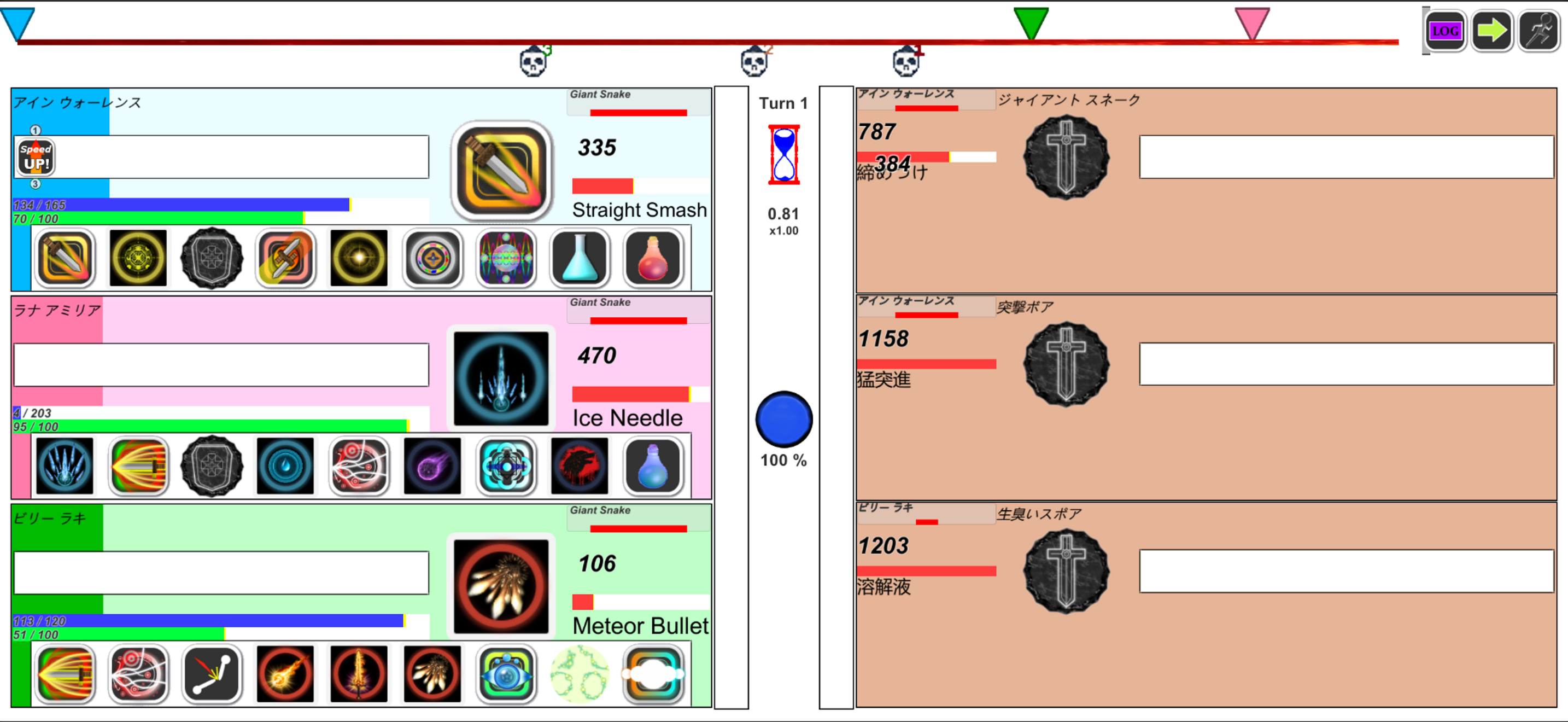 メイン行動: 戦闘ゲージ進行が進行し、ゲージが到達すると自動的にアクションが繰り出されます。