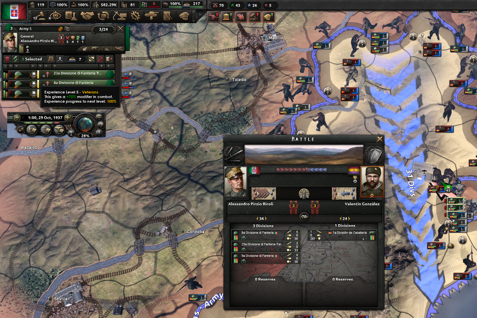 戦闘状況を少し見てみよう。我々イタリア軍は多数の軍備を備えており、敵の編成は1部隊のみ。
