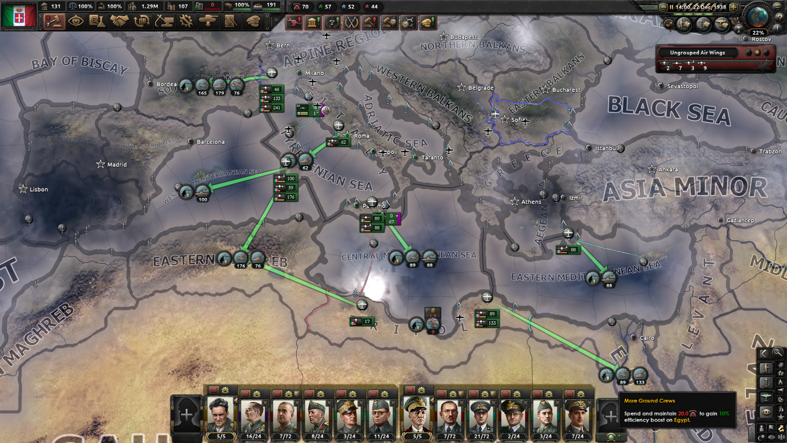 画面のスクリーンには3部隊しか空軍が存在しないが、イタリア本土に多数の空軍が待機しているはずだ。