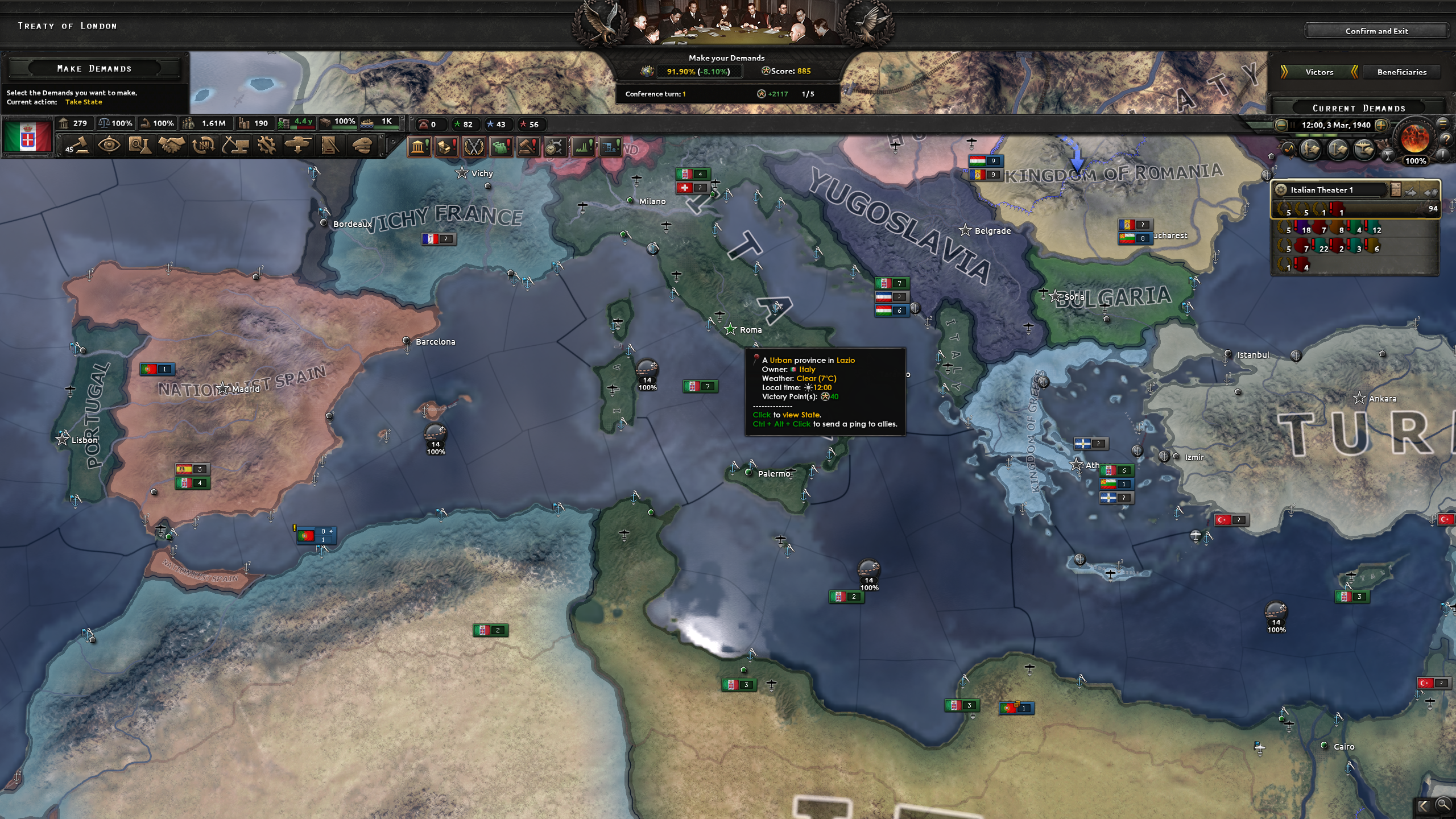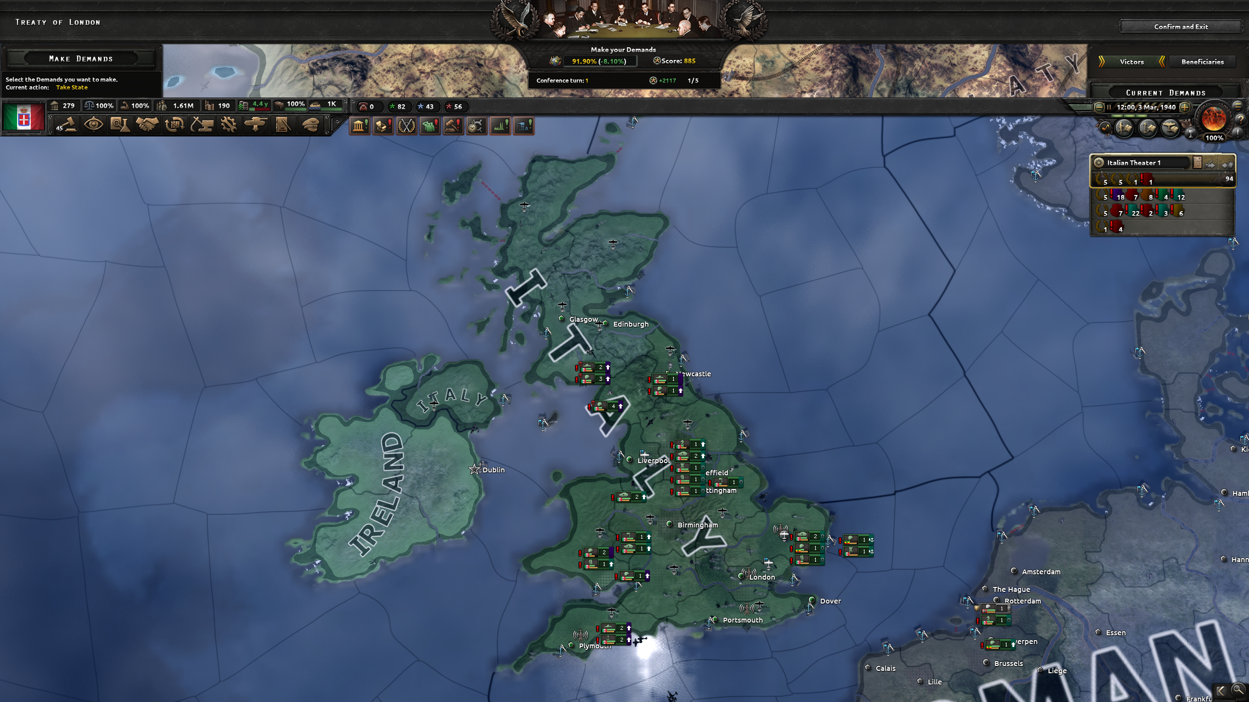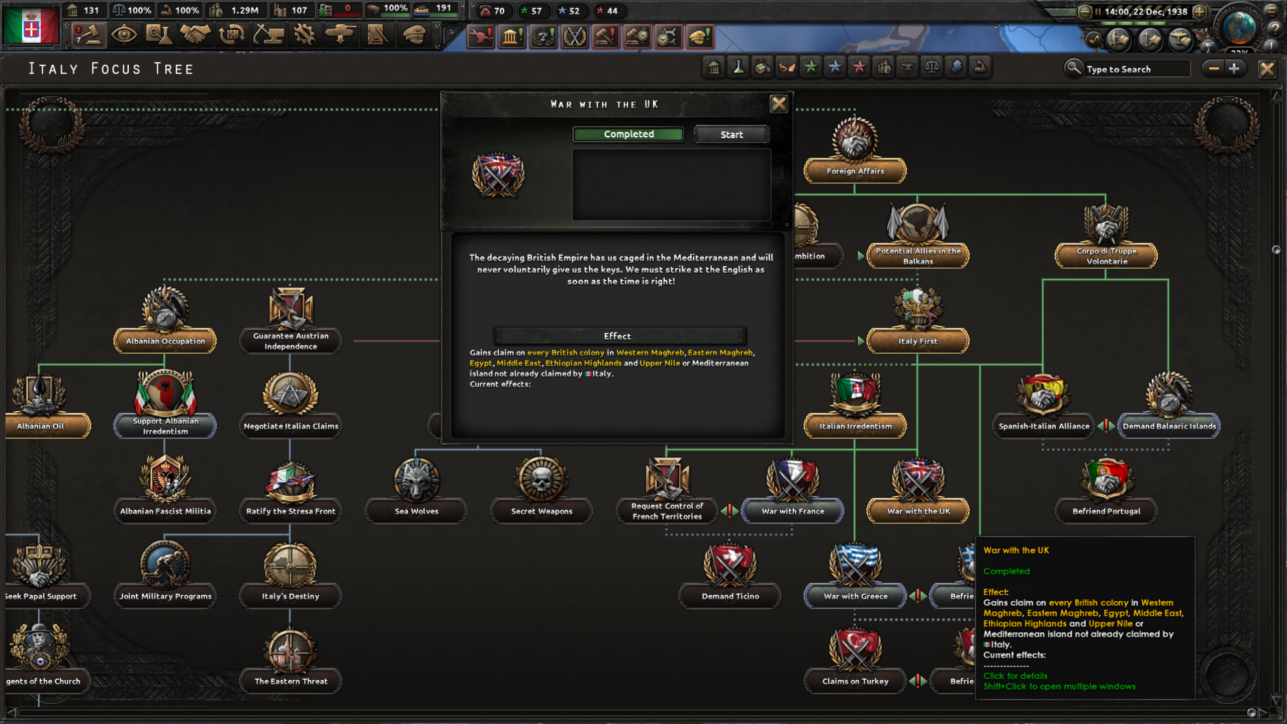 ※補足1 ゲームとしては、国家方針ツリー「Italy First」および「War with the UK」を取得して、戦争を仕掛ける事。