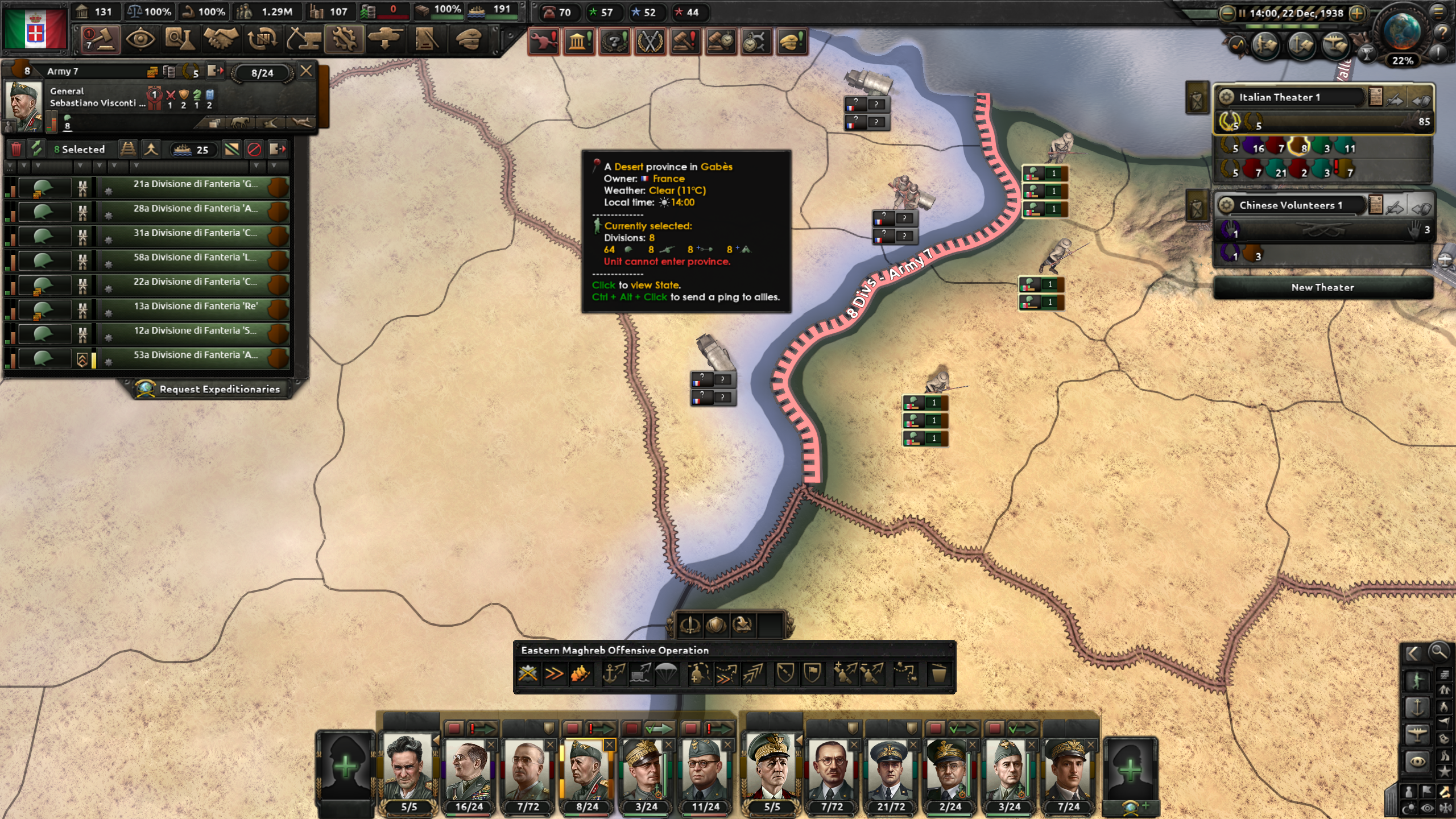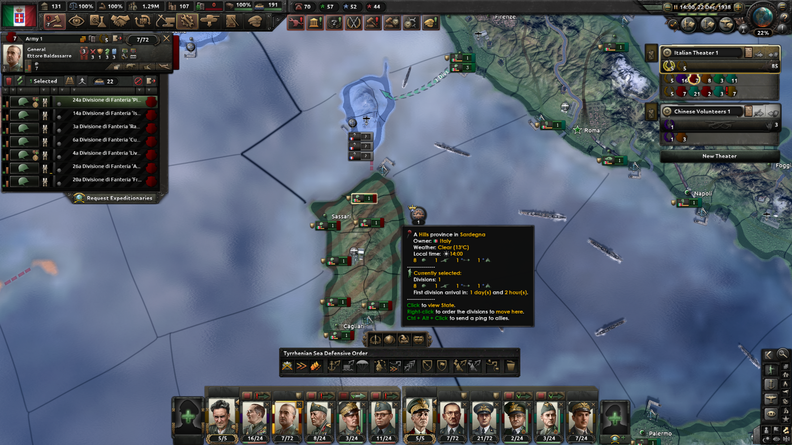 そのためには、イタリア本島からコルシカ島へ攻める所に幾つかNaval Invasionを仕掛けておくと良いだろう。