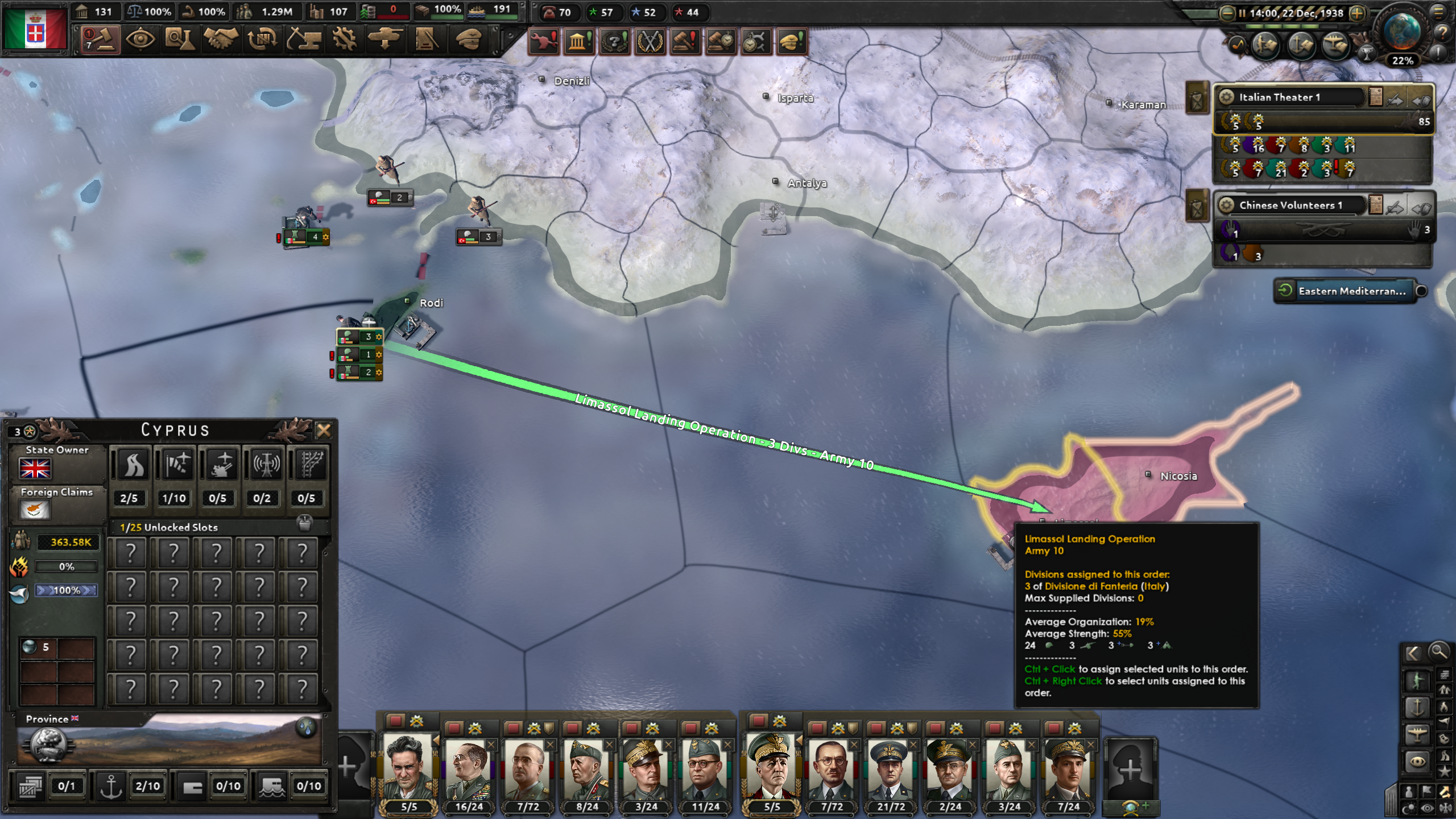 マップを拡大しないと気付きにくいが、キプロスという場所がある。そこもNavalInvasionを仕掛けよう。