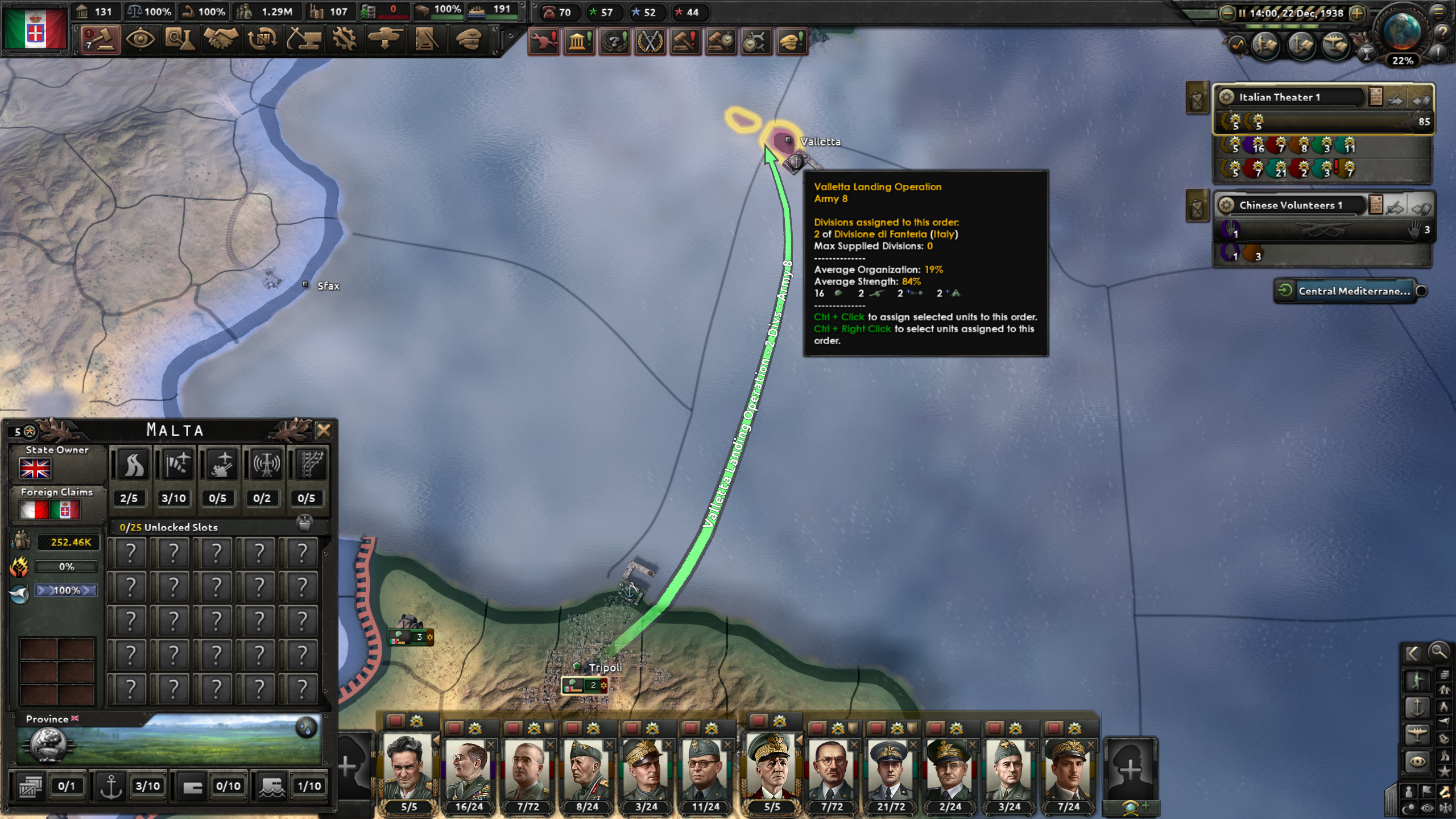 イタリア本島の下の方からマルタ島へNaval Invasionを仕掛けておくと良いだろう。戦闘開始した直後、