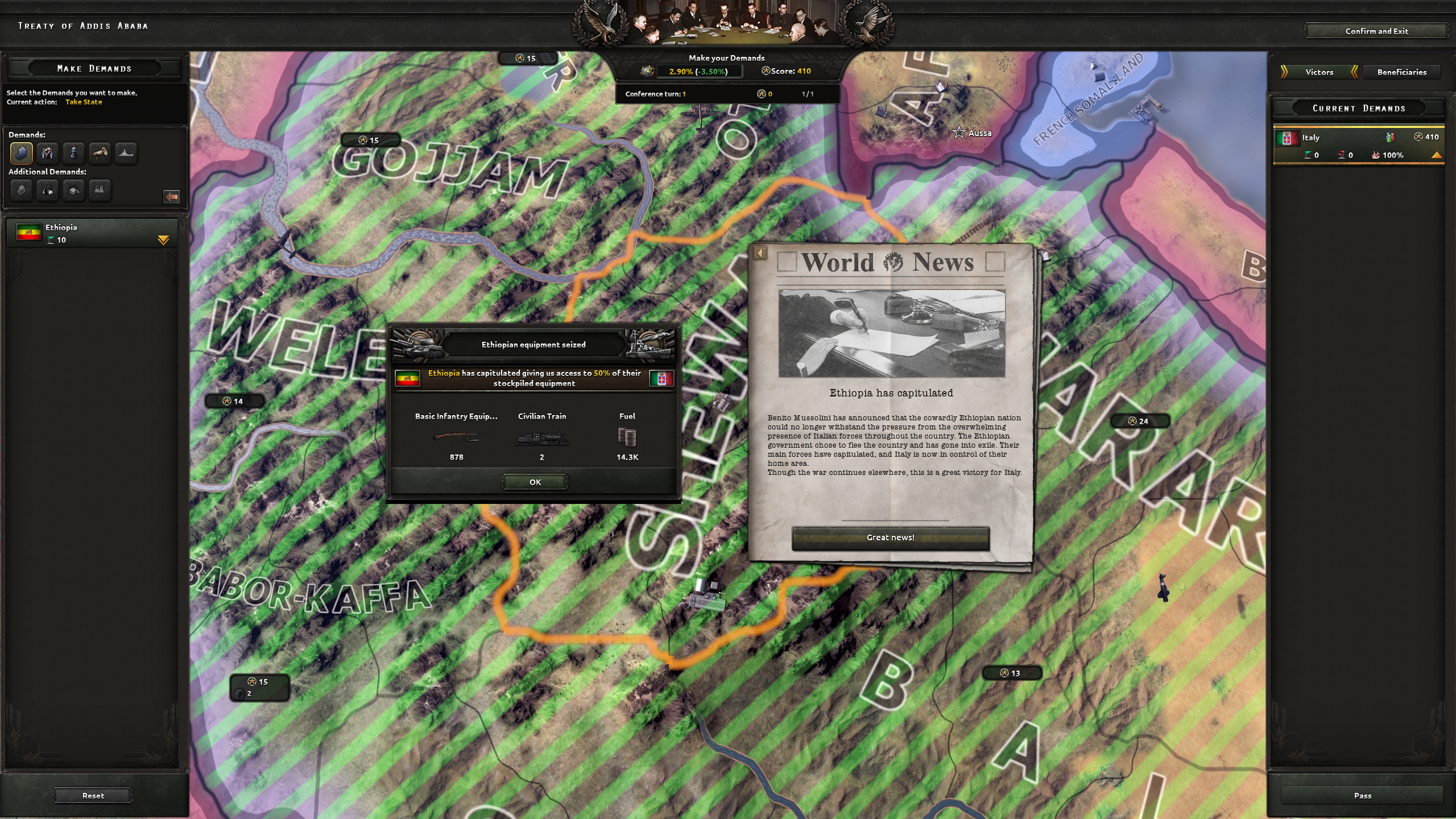 ただし、エチオピア戦は参加者がイタリアのみのため、講和というか独断で決める事になる。